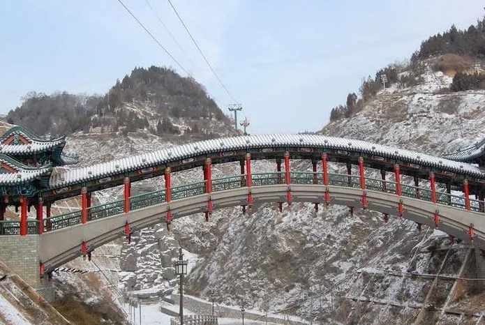 興隆山雲龍橋俗稱卧橋,雄踞於大峽河上,連接興隆、棲雲兩山,原為純木結構,上有橋廊,下無橋柱,利用卯榫結構成橋。初建於乾隆二十八年,即公元1763年,原金縣知縣唐鳴鐘和道士劉一明前後各架過名為“唐公橋”和“迎善橋”的木橋,都被山洪沖毀。現橋重修於光緒二十六年,也就是公元1900年,甘肅布政使岑春煊撥銀重建,知縣陳昌把它改名為“雲龍橋”。橋高6米,長38米、寬米,橋上建廊房5間,嵌以斗拱,東西兩頭建有橋亭。陳昌以為連接兩山道路相通,也連接兩山靈氣相通,命名為“雲龍橋”,並撰聯:雲比泰山多年年霖雨蒼生豈徒供仙人怡悦,龍如蒼海卧面面林巒翠靄都覺有靈氣往來。雲龍橋是興隆山古建築之一,也是興隆山的標誌之一,是大峽河上惟一建築,也是登山的必經之路。1980年列為省級文物保護單位。1981年,因為當時橋身已經傾斜,政府撥款進行改建,改為混凝土結構,並維修了橋廊和橋亭。1985年,蘭州市園林局重新彩繪此橋,將陳昌所題的對聯刪字後,由甘肅書法協會副會長趙正書寫,懸在亭前。
