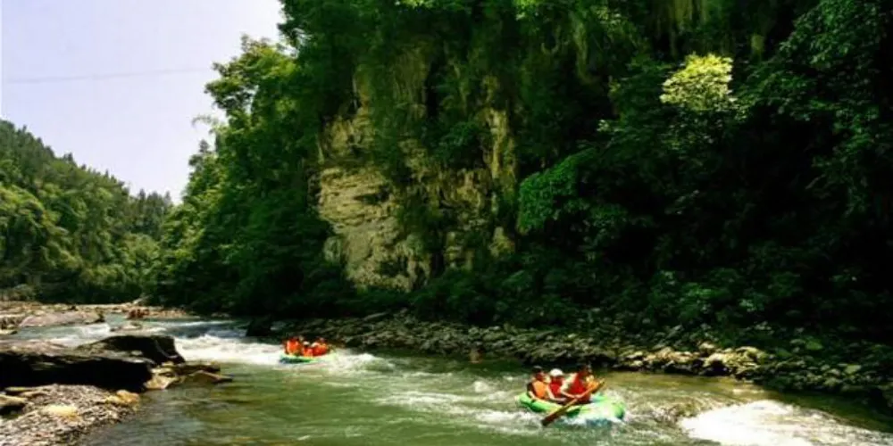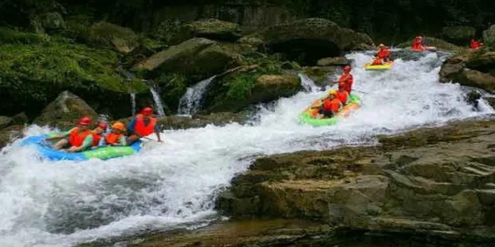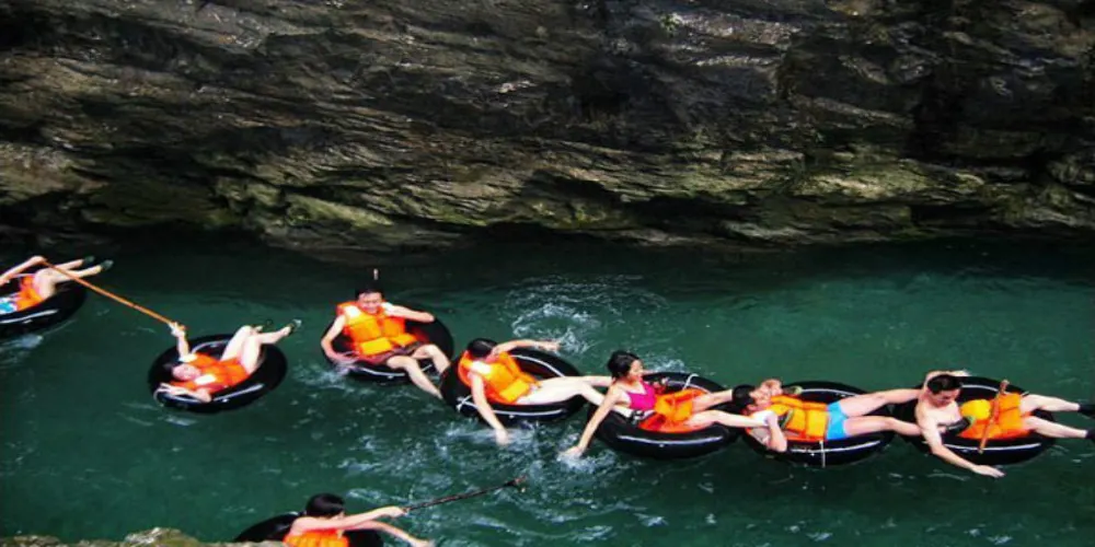 景區內河道長度16公里,有8公里水上漂流、泳池嬉水、釣魚、品茶等旅遊項目。8公里長的峽谷漂流,是景區的傳統旅遊項目,沿途山青水秀,峽谷漂流驚險,深受漂流愛好者喜愛。乘坐橡皮艇,隨波谷浪尖漂流而下,具有特色的是漂流要經過一段狹窄的暗河,經過其中宛若進入了歷史長河時空隧道,令人遐想萬千。