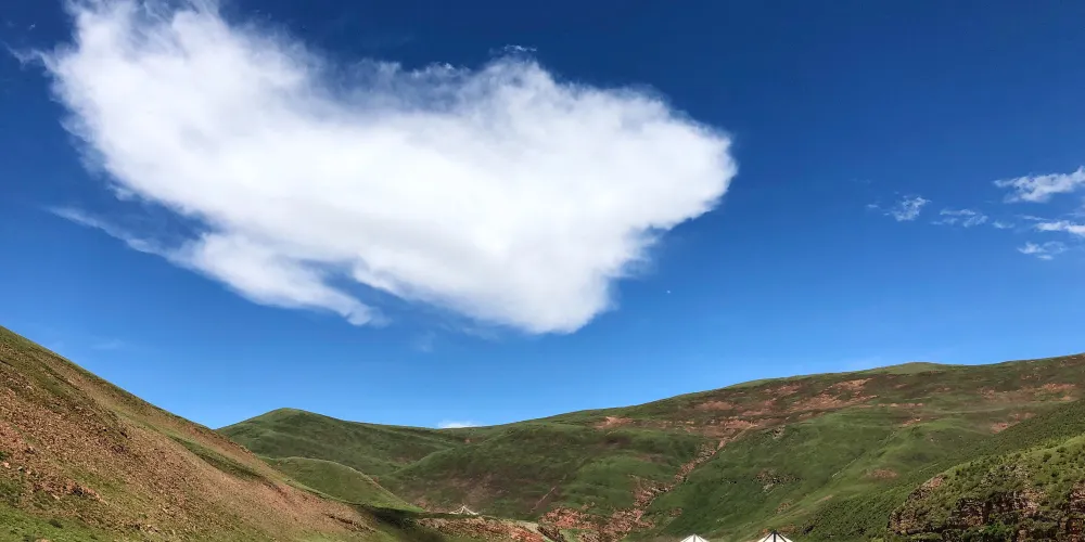 這是一片遼闊的草原,空氣很清新,周圍的風景很美,躺在草原上可以看到湛藍的天空。