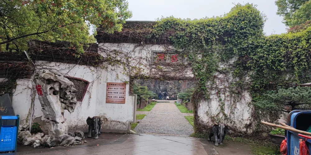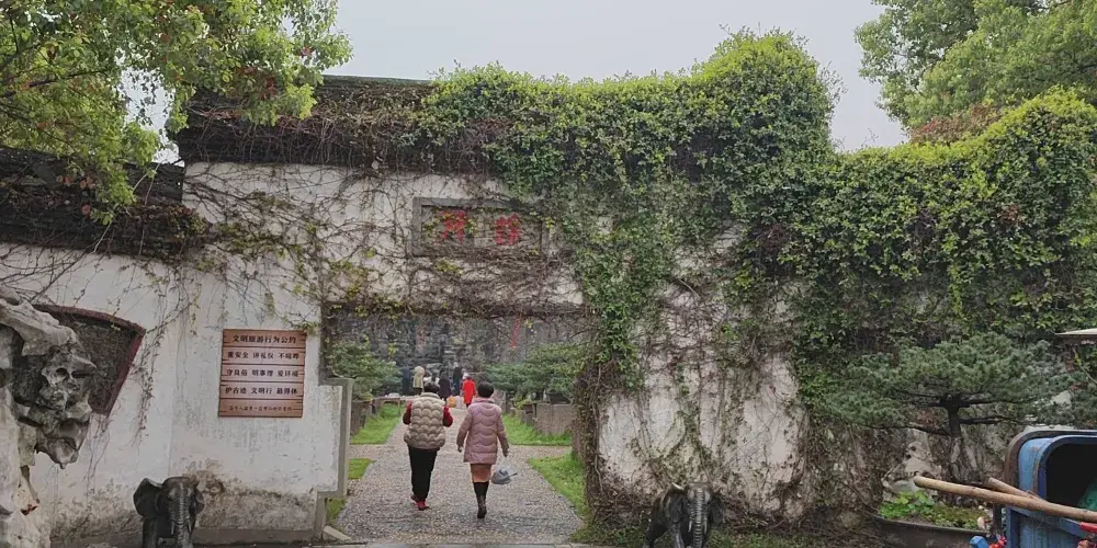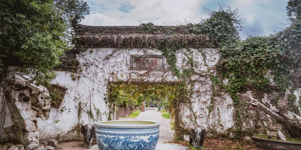 餘苑是天香園的園中之園,未進苑先聞到轟隆水聲,這正是餘苑的點晴之作——飛瀑,此瀑高12米,寬70米,這是江西省較大的人工瀑布景觀。餘苑以瀑為屏、東居佛、西築亭。佛為六噸重笑面迎客佛。亭為天地雙亭,兩亭比肩而立,亭角相攜,寓意:天地和諧、風調雨順。此苑斜對面是曲回長廊,依水而築古意深醇,彎延至處是民居小樓,數十棟各種明清風格的江南小居,散落在森幽的古樹林中。
