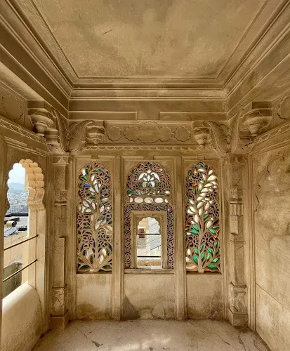 如果是早上來這裡的話,可以看到在陽光的照射下,整個宮殿金碧輝煌,十分壯觀。走進宮殿後你就能發現,這裡有來自拉賈斯坦全邦乃至波斯、歐洲的傢具和裝飾品。而四周的牆壁更是美妙絕倫,巧奪天工。上層陽台上那隻不知使用了多少塊玻璃和鏡子製成的孔雀更是讓人感歎古代工匠無窮的智慧和超凡的技藝。進入下層,你會到達一個軍械庫,裡面有一些古老的武器。