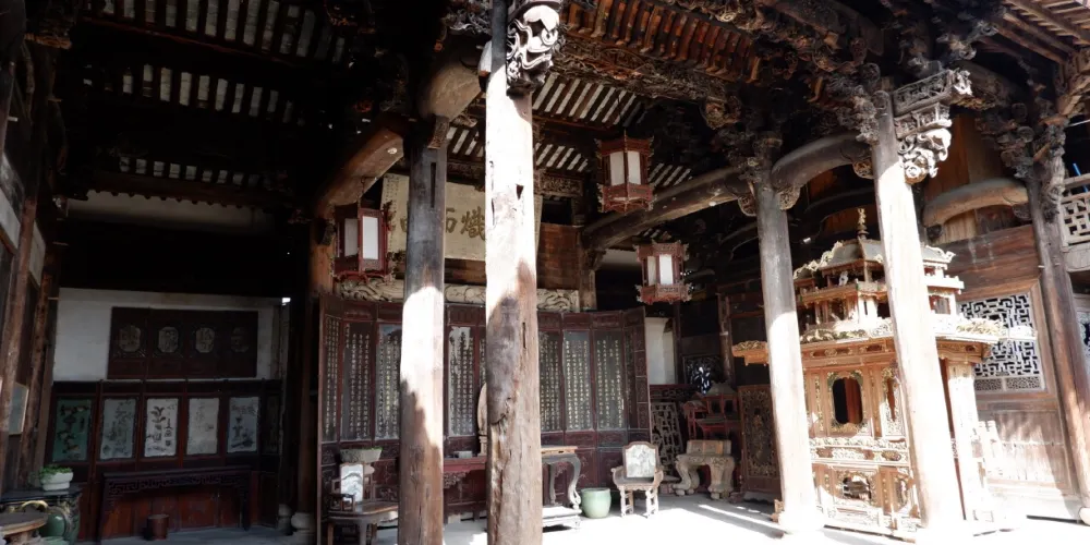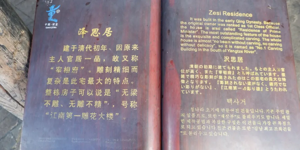 澤思居建於清代初年,2002年修複。因原來主人官居一品,故又稱“宰相府”。走近澤思居,可以發現此宅簷頭四注,馬頭牆高聳,整個建築氣勢恢宏。院內廳堂軒敞,廊柱挺拔。雕刻複雜是此宅的特點。整棟房子“無梁不雕、無雕不精”,號稱為“江南一雕花大樓”。進門可以看到正樑上刻有“四仙迎賓”的典故,體現了主人的待客之道。正廳東首樑上刻有五隻仙鶴,既說明了原來的主人是文官而不是武官,又體現了他的“五嶽朝天”的志向。從西首樑上的“百鳥朝鳳”圖可以看出這不是普通的官宦人家,因為這些圖案並不是普通人家可以任意雕鑿的。