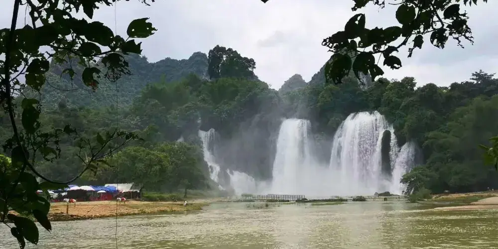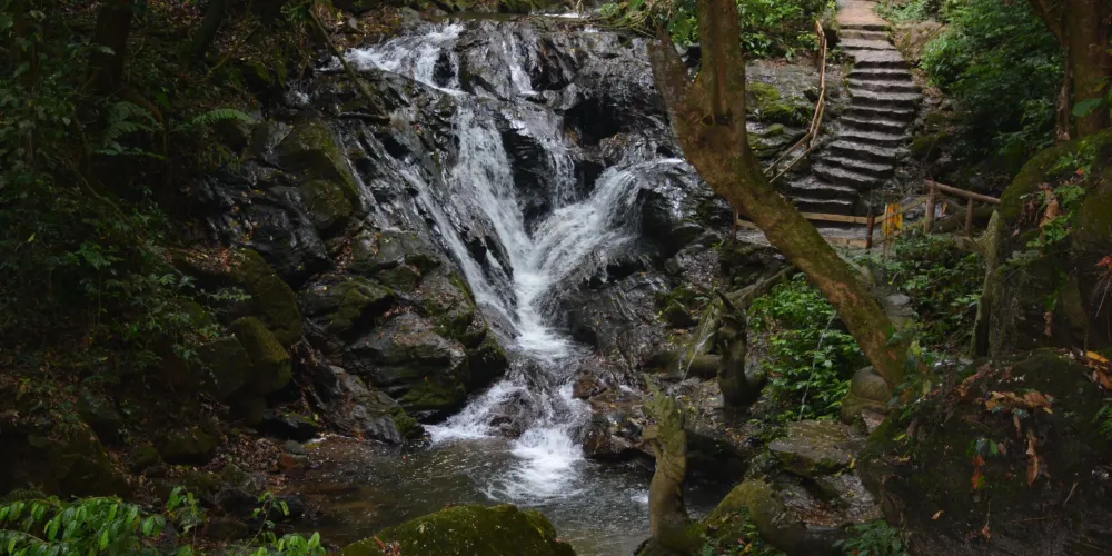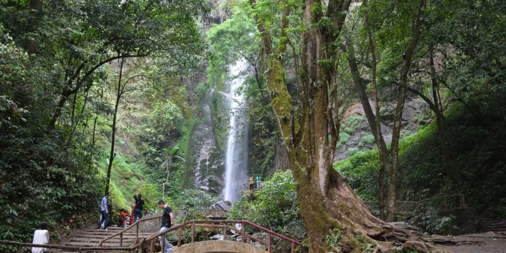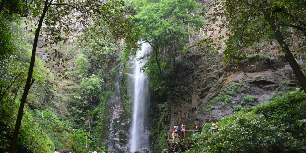 扎朵瀑布位於潞西、隴川、瑞麗三縣市交匯的莫里峽谷,藏於山巒疊翠、萬木崢嶸的亞熱帶雨林深處。清澈的泉水從40米高的懸崖陡壁傾瀉而下,似一匹巨幅白綢在空中迎風飛舞,高峯懸崖間雪飛雲湧,響聲雷鳴,瀑布下又有一條小溪潺潺而過,是整個景區的靈魂,如果能在早晨日出時來到瀑布前觀賞,實在是一種享受。