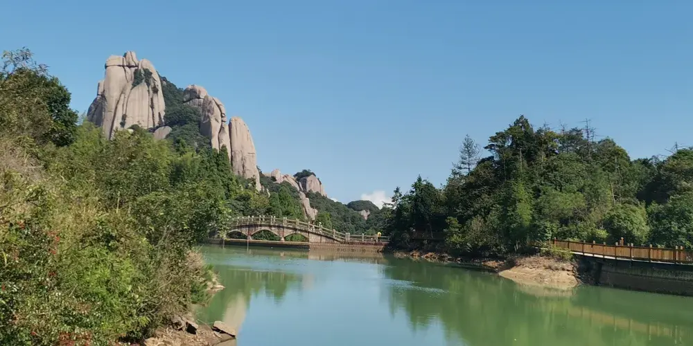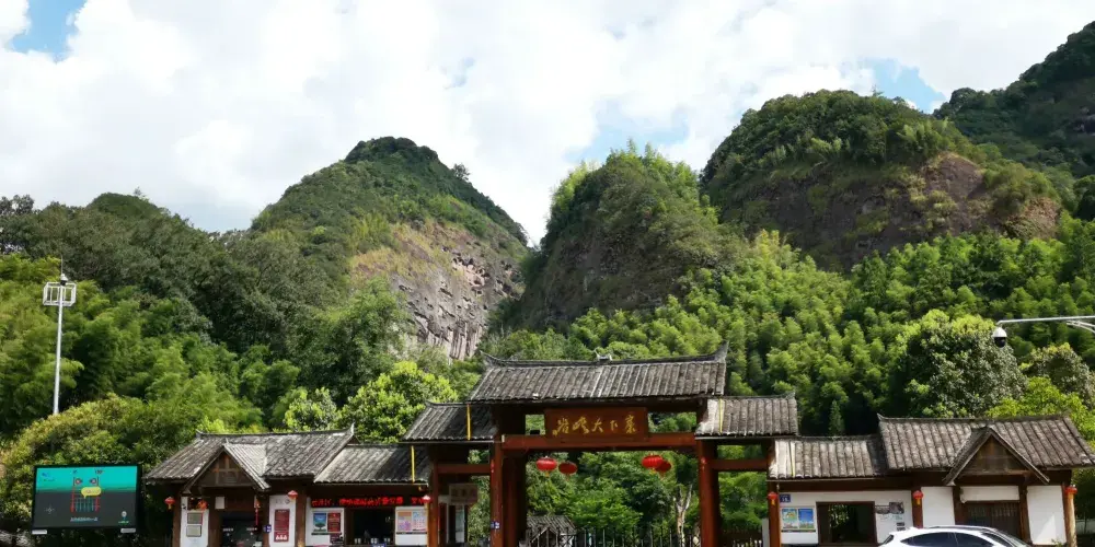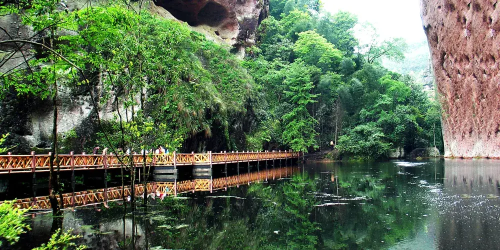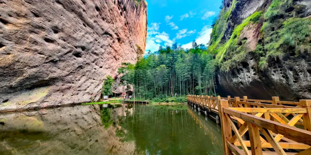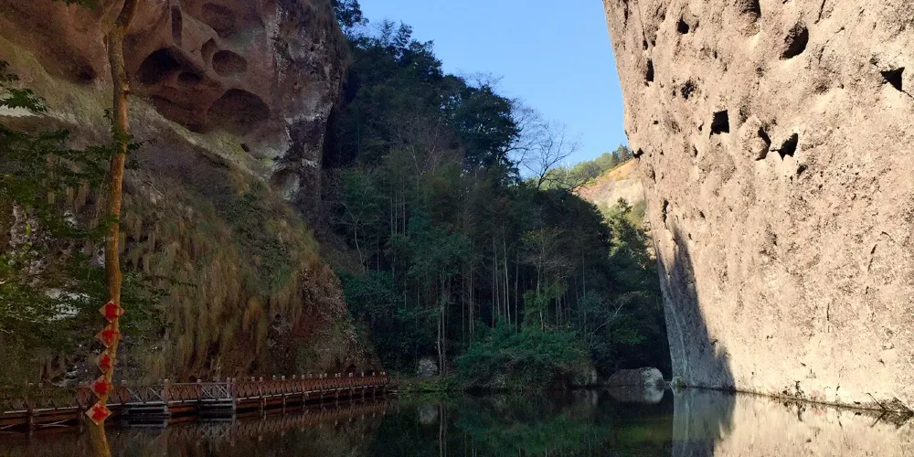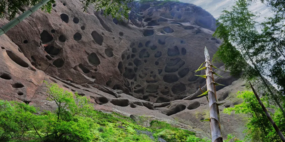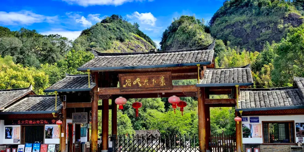 甘露岩是一個天然的內窄外敞的洞穴,高約80米,深30米。洞的上下為礫岩,中層為砂岩,滲出的泉水經岩層濾淨,清甜甘冽如甘露,寺廟因此被稱為甘露岩寺。寺廟始建於南宋紹興十六年(公元1146年),洞穴上部寬30多米,下部寬卻只有10多米,呈倒三角形,古人則以獨木擎天的方式解決岩勢上寬下窄的難題,這也是岩寺最神奇的地方。一根柱子落地,上面建起了四幢樓閣,整個重簷歇山式的層樓疊閣包括上殿、蜃閣、觀音閣、南安閣等建築,皆仗一柱支撐,頂部更無片瓦,若用“懸空寺”、“飛來寺”、“獨木寺”來稱呼它皆名副其實。寺廟全部建築都是木質,用T形拱頭相連接,未用一根鐵釘。是我國南方少有的古代木構建築群。據考證,12世紀時日本重源法師到福建考察,回國後在舉世聞名的奈良東大寺大佛殿的建造中大量使用的“插拱”,取樣於甘露岩的T形拱頭。50年代,甘露岩寺被列為省級文物保護單位,北京建築研究所專門派人考察,並在《人民畫報》上發表了該寺的照片。60年代初,廟內失火,建築被燒毀。現存的寺廟是按照原有建築風格重新修建的。