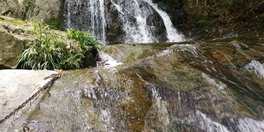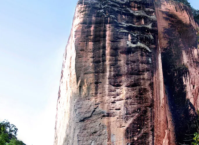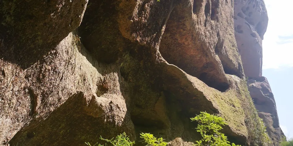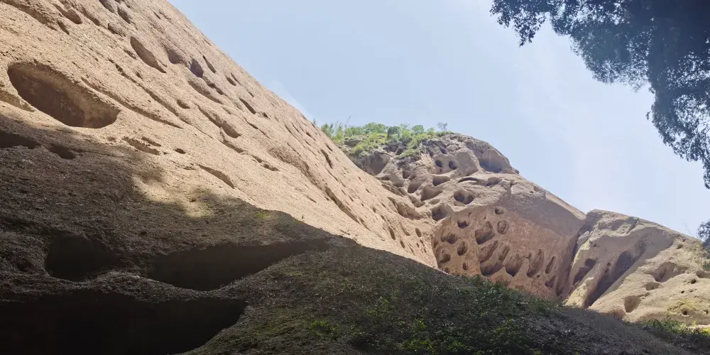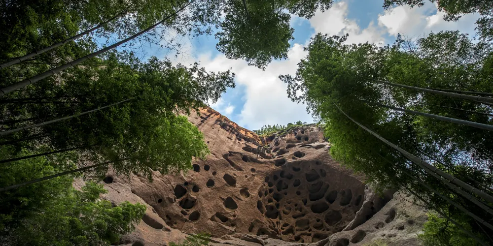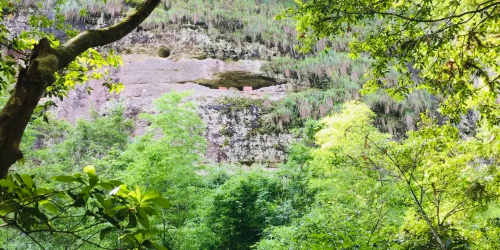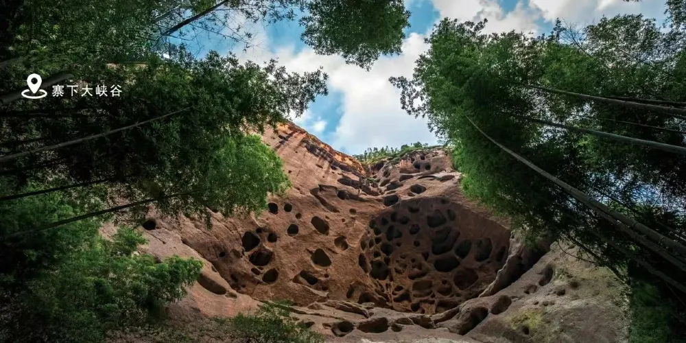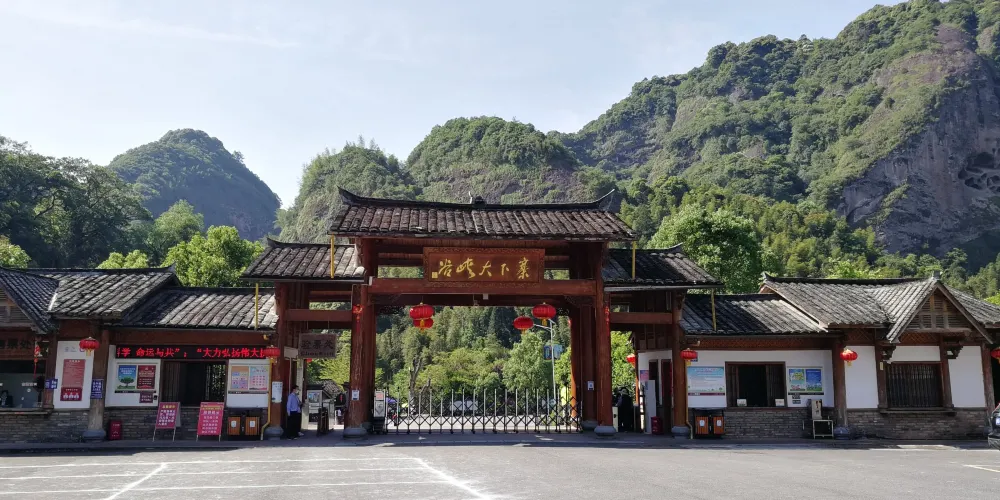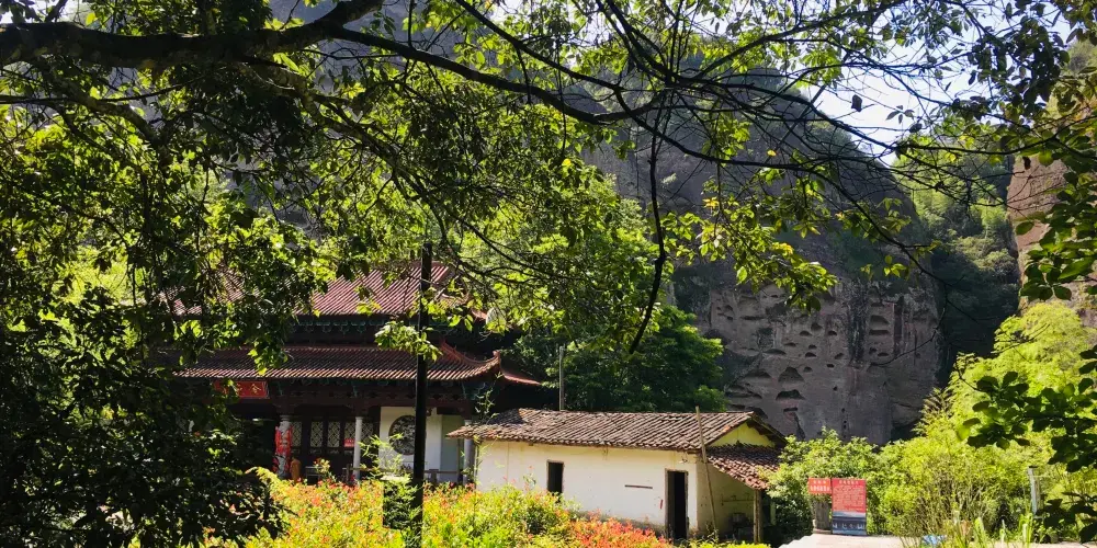 甘露岩寺隱藏於赤石深壑之中,左邊一塊紅色岩石像一口大鐘,右邊那塊像一面巨鼓,有“右鼓左鐘,妙(廟)在其中”的說法來形容其地理位置。鐘鼓石前有三棵古松,岩寺的山門碑刻上題有宋朝進士鄒恕讚美寺廟建築特色和景物的詩作。