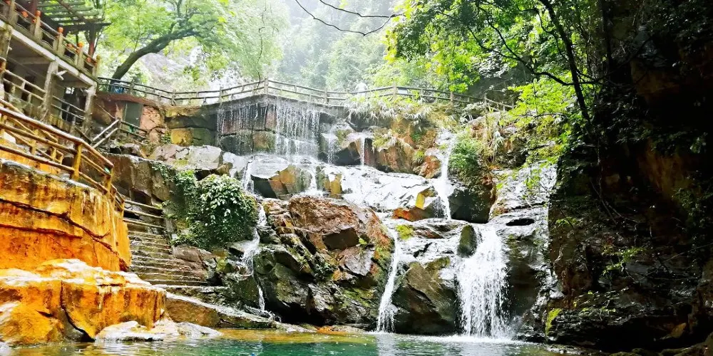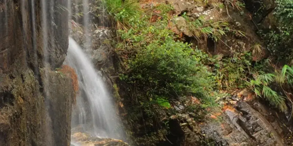 沿登山曲徑至山腰岔路右折,過眠綠亭,即到飛水潭。飛水潭瀑布白練懸空,高30餘米,從懸崖峭壁間傾瀉而下,聲震雷鳴,霧障雲騰。潭上時而激起滿空飛雪,時而陽光折射,彩虹橫空。站在潭畔觀瀑亭上觀賞,沁人肺腑,心曠神怡。