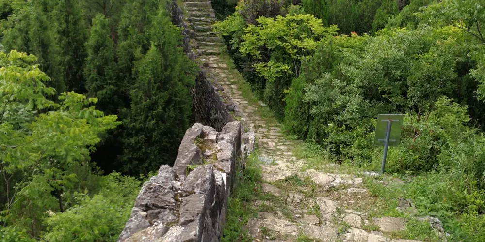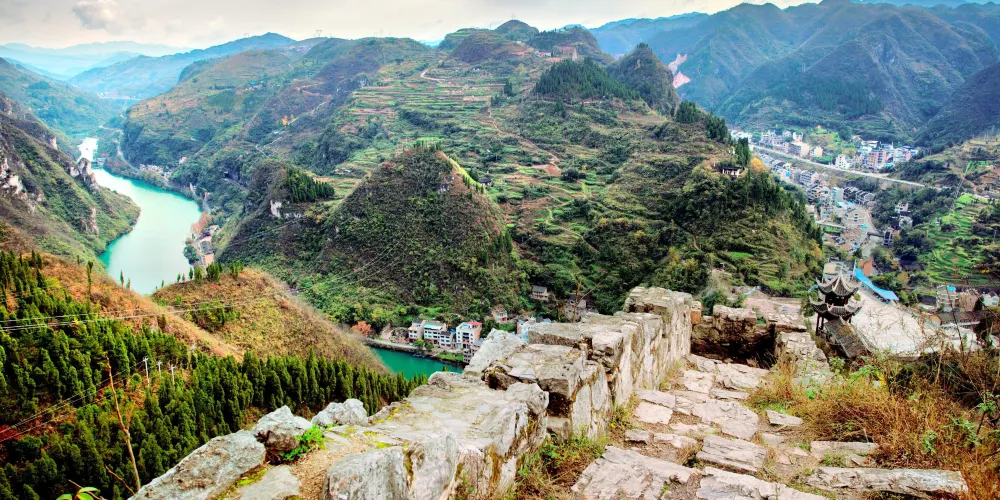 鎮遠府城垣位於石屏山山頂,石屏山上有觀景台,可俯瞰鎮遠城,位置剛好和青龍洞互補。從觀景台繼續向上爬到頂,就是石屏城垣遺址,三公里長的古城牆,逶迤起伏。沒有修繕,真正的遺跡,給人無盡的滄桑感。
