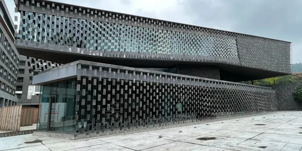 知美術館位於中國成都新津老君山腳下,總建築面積為2353平米。外形內斂、極具禪意,由國際建築大師隈研吾設計,運用流水、瓦片等元素,使建築與自然有機相融,空靈寂靜,動靜相宜,盡顯生生不息、道法自然的東方哲學。美術館VI系統由日本平面設計大師原研哉設計,由美術館外觀瓦片的元素構成,形成富有變化的水波紋樣。