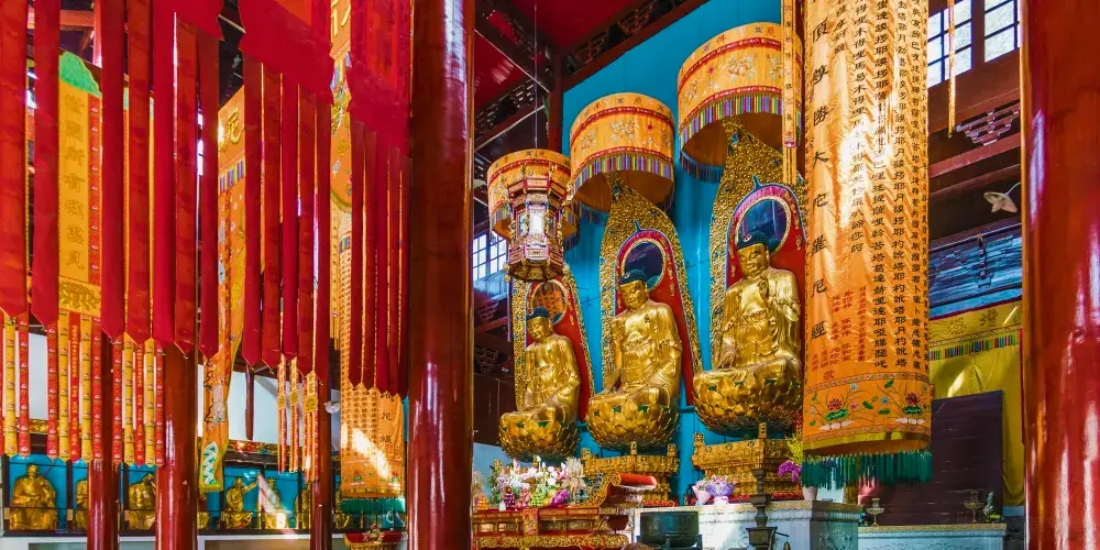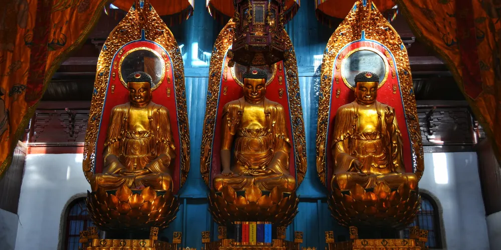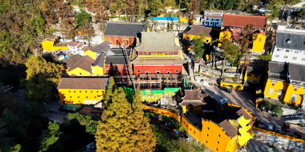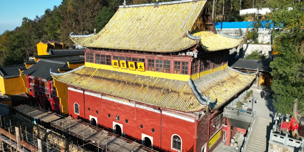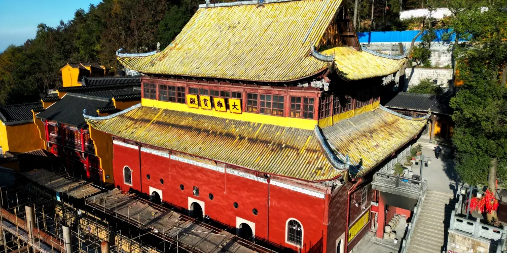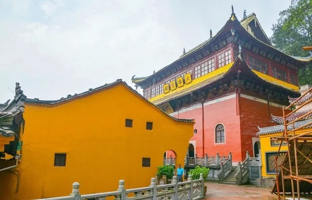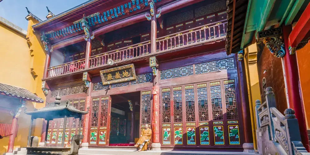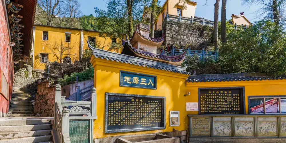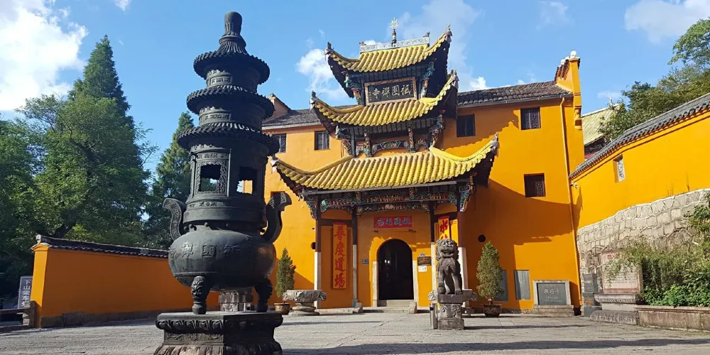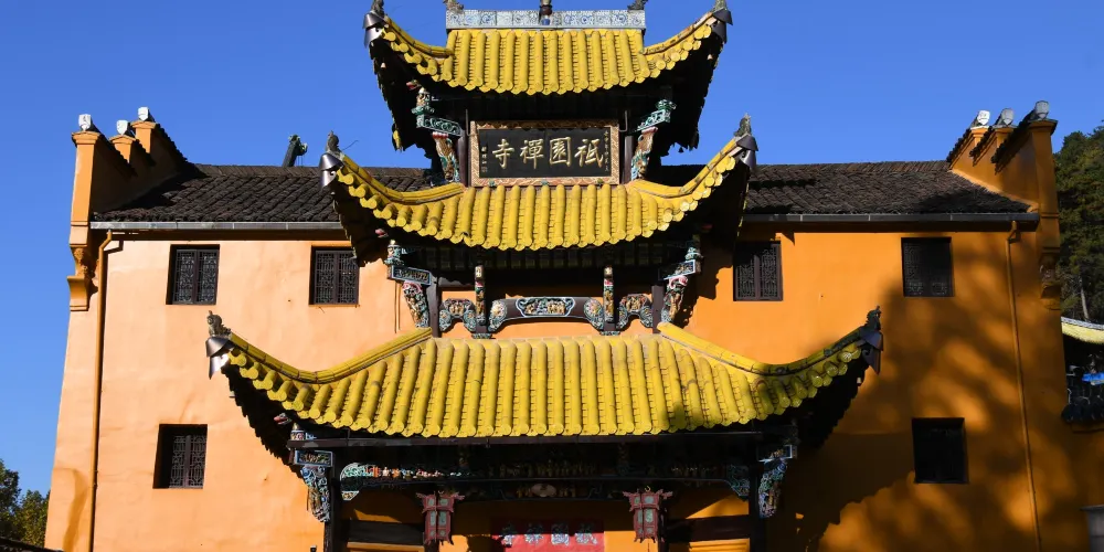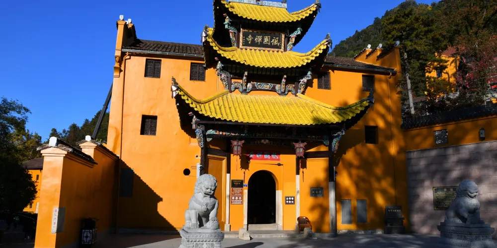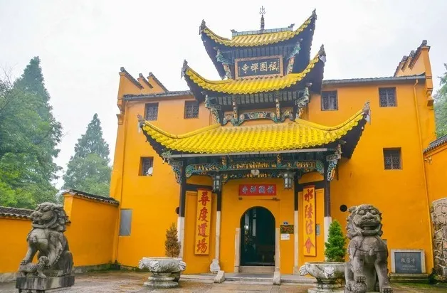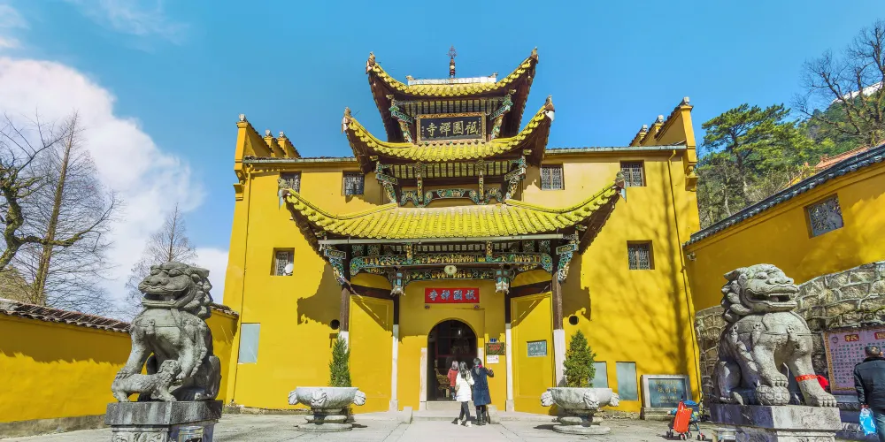 祗園禪寺位於池州市東南處的九華山上,寺廟外觀獨特,很多遊玩者都在這裡拍照留影。寺廟始建於明嘉靖年間(公元1522年-1566年),寺前的石板路上刻滿錢幣浮雕。祗園寺南端的靈官殿正面三層屋簷嵌入黃色牆壁,覆蓋黃綠色琉璃瓦,側面伸出馬頭牆,外觀具有特色。廟內佈局呈“7”字型,靈官殿,往東北方向是坐東朝西的大雄寶殿。