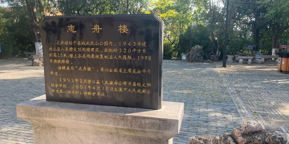 志舟樓位於城北,清康熙年間,澄江知府張聖治曾在此建萬壽宮,起蓋閣亭,栽花植木,後幾次修整,有了一定的規模,由於歷史的更迭,萬壽宮時盛時衰,到清末漸廢,直至殘破毀滅。人們對此地絢麗多姿的景色戀戀不捨,清新的空氣逗人喜愛,還是遊人不斷,引人入勝。1943年,當時任澄江縣長的劉承功又看中此地,便向各村攤派民夫,用兩年時間,在萬壽宮原址上建蓋了一個三層樓的樓閣。樓閣建成後,時值抗日戰爭勝利,縣府召集城鎮和四周鄉村的民眾在此舉行落成典禮大會,縣長劉承功定此樓為志舟樓。志舟樓建起後,此地就成了有名的風景區。
