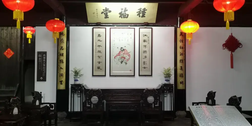 推開大門而入,一進為“前廳”,前廳後是個小天井;二進“轎廳”,是大戶人家用來停放轎子的地方,非常空曠,另外這裡牆門頗厚,可防強盜;三進是正廳“種福堂”,堂上匾牌傳為康熙年間翰林侍讀學士陳邦彥所題,以此告戒後人“平日多行善積德,日後定能使子孫得福”。這裡還有一個特別的地方是:不只一樓鋪地磚,樓上的樓板上面也鋪有方磚。