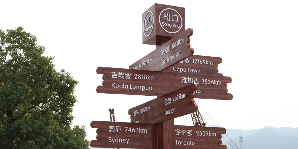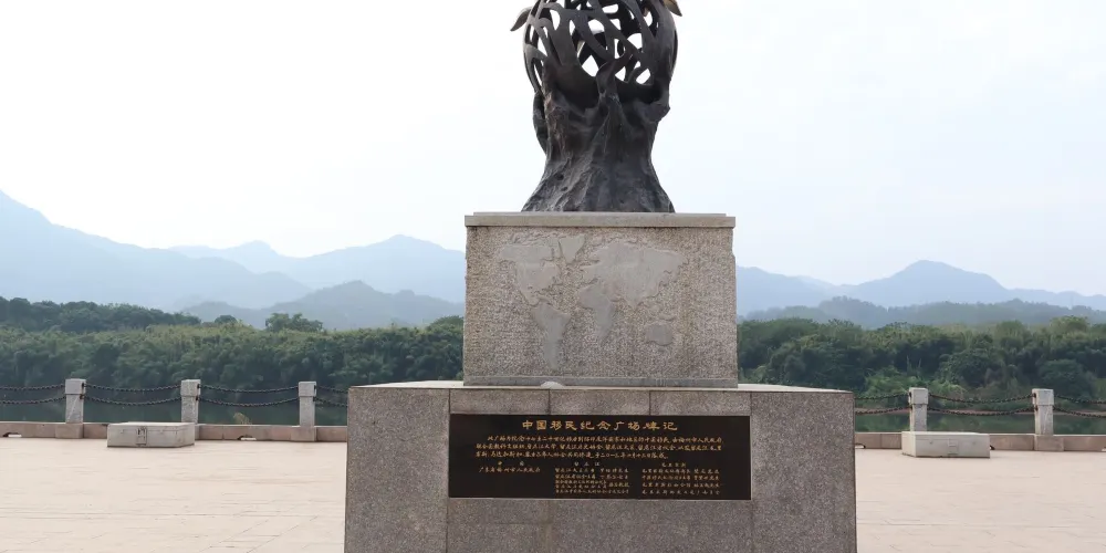 紀念廣場中央的紀念碑以「開拓進取、心繫家園」為理念、以海外華人「跋山涉水、遠渡重洋」為切入點,重點突出鬆口是客家人「揚帆出海,開拓進取」的始發地,同時 也是客家華僑們的回歸地,充滿濃厚的鄉情與親情。