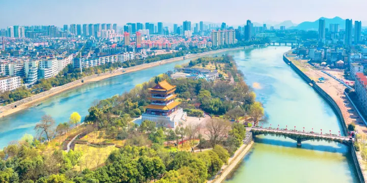 狀元洲亦稱盧洲,坐落於宜春市區東側,秀江中流,面積約6公頃,形似巨艦。唐文人盧肇曾在此豎石為銘,苦讀詩書,後中狀元,故名狀元洲。明代邑人列聰購得此洲,建“盧洲書屋”供子弟讀書,後郡人建有“三元閣”、“文標閣”,然清道光年間悉毀於洪水,1985年,被闢為水上公園,陸續築有假山、水池、涼亭、牌樓等,修建了遊泳池及娛樂遊藝設施,並構建仿古建築“盧肇讀書堂”。
