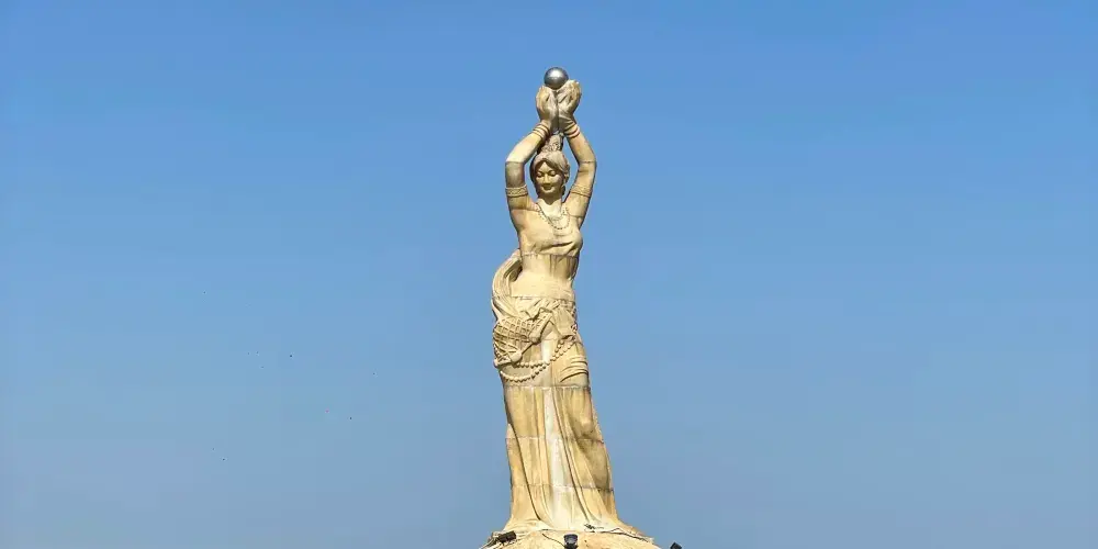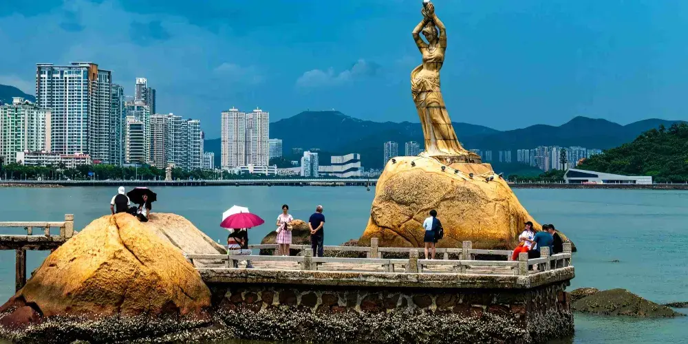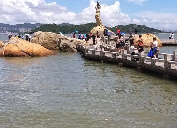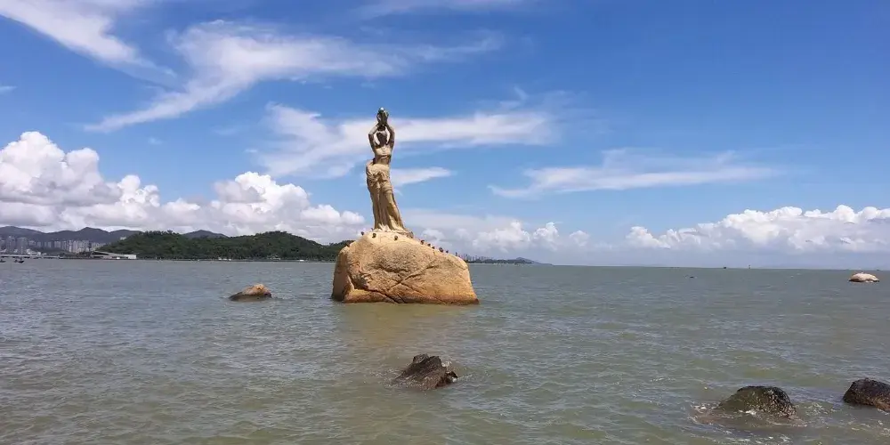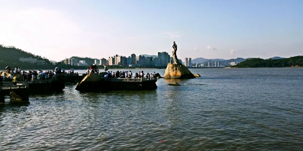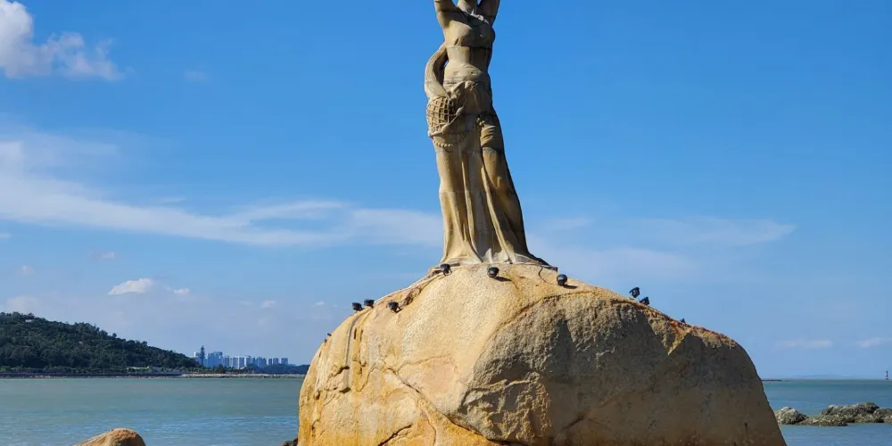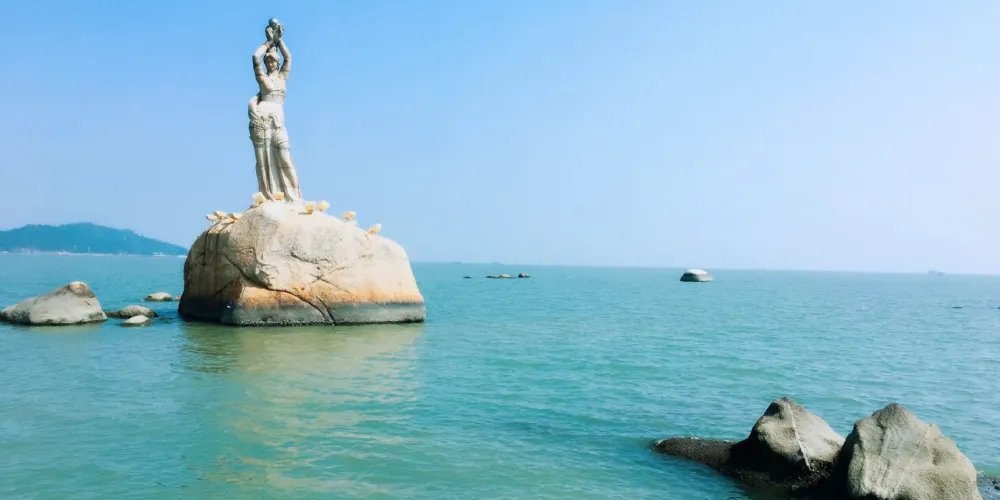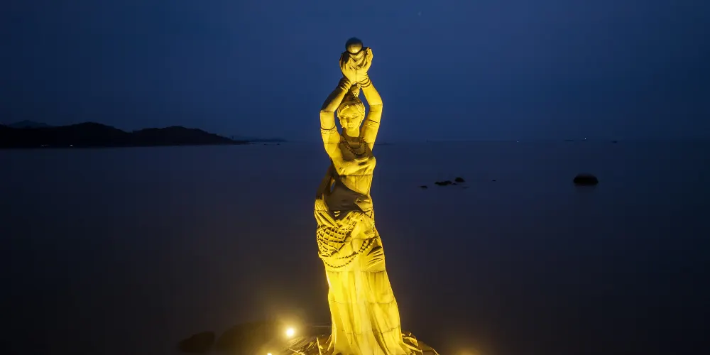 珠海漁女雕像位於香爐灣畔的情侶路上,雕像身高約8.7米,由70餘塊花崗岩打造,是珠海的標誌性景觀。雕像造型來源於珠海的一個美麗傳說,她身上纏著漁網,雙手舉著碩大的寶珠,姿態優美。珠海漁女所在的情侶路也是知名景點,散散步或者騎行都不錯,附近還有貝殼形狀的珠海大劇院,夜晚看上去更加漂亮。