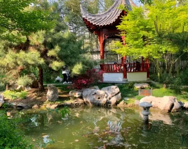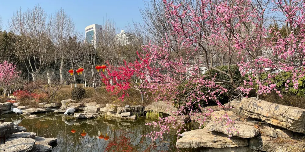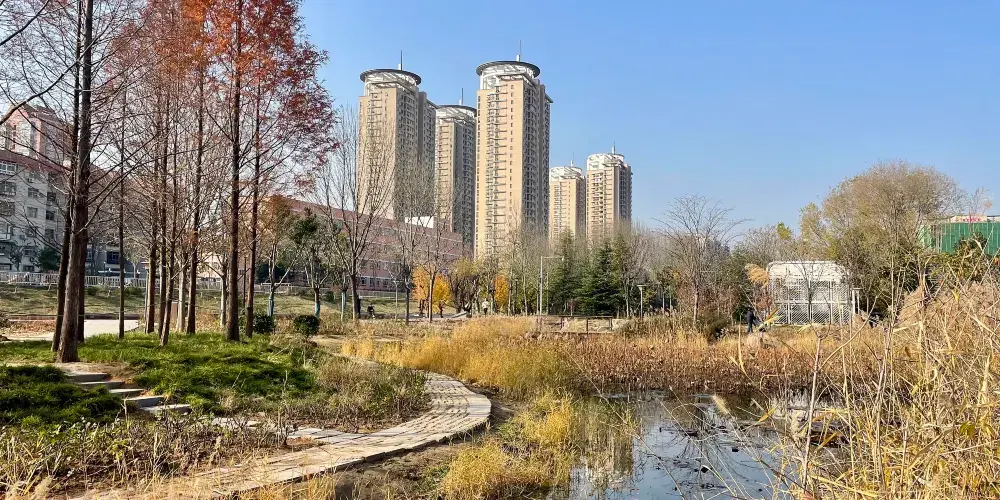 生態庭園巧妙融合歷史遺存與現代景觀,以金水河為天然分界,形成東、西、南三園鼎立的獨特格局。東園環湖步道串聯兒童樂園與健身廣場;西園主打植物造景藝術,主要景點有月季園、湖心島、釣魚村、櫻花山等;南園透過懸索吊橋與東園相連,有薔薇園和敬林園和部分商代遺址。歷史遺址與生態景觀融合,使紫荊山公園成為解讀者都文化、體驗城市慢活的好去處。