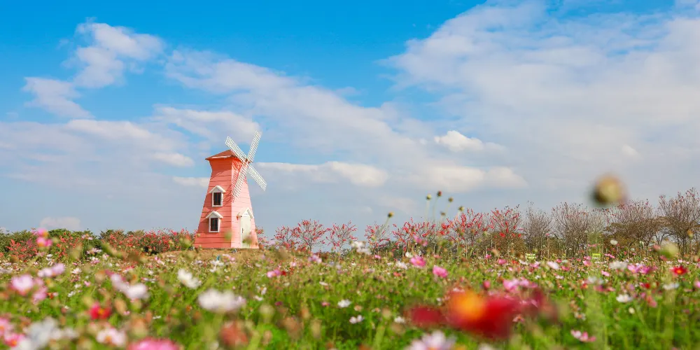 紫溪半島花海世界位於廣東惠州,園區內有水上高爾夫、草坪滑梯、網紅千秋等多種項目,其中草地上還有小型的蒙古包,也可以參觀。園區內有很大一片草原和一些綠植,風景優美,空氣清新,讓人們在忙碌之餘遠離城市喧囂,內心可以得到一片寧靜。