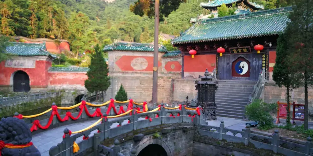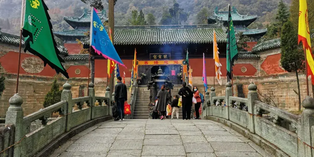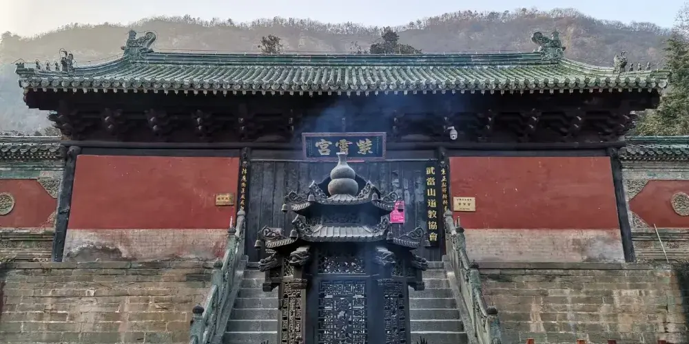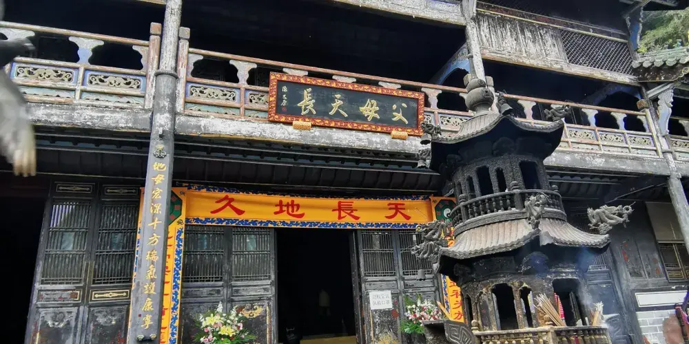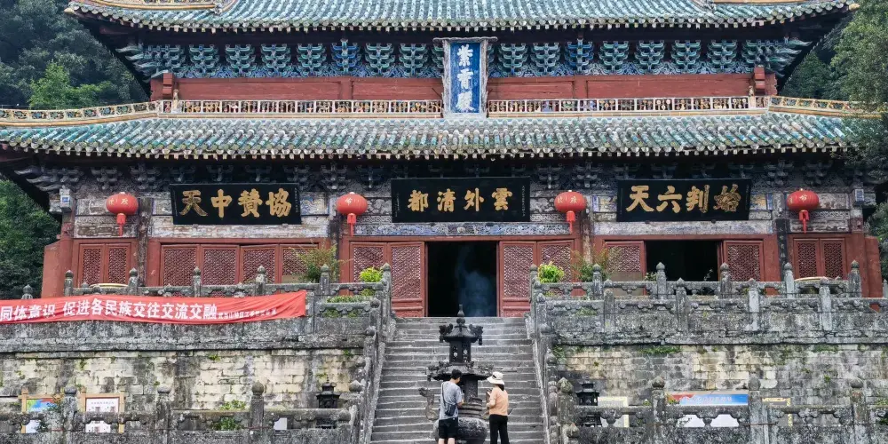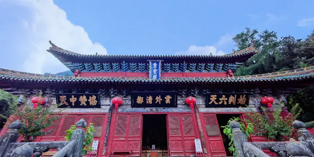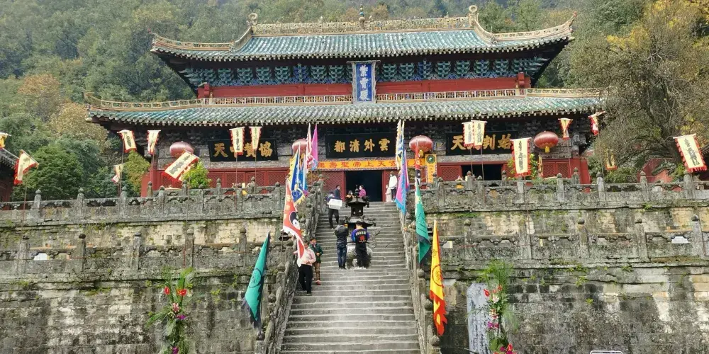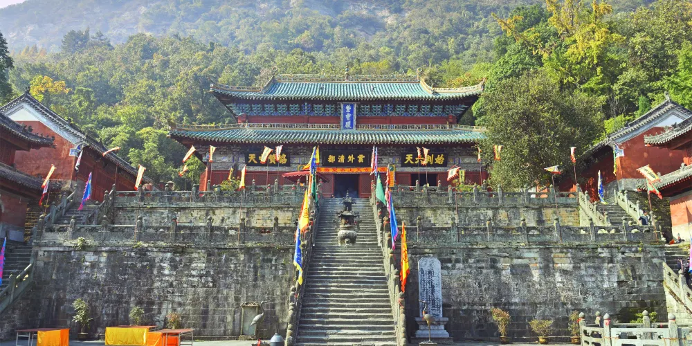 當你從陡峭曲折的古道經過南天門,來到南巖宮大殿(玄帝殿)時,會覺眼前豁然開朗,腳下是深不可測的黑虎澗,向前方望去,武當山的主峰——天柱峰在眾山環擁中,滿目青山,雲霧繚繞,會產生飄飄欲仙的感覺。