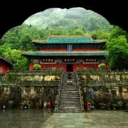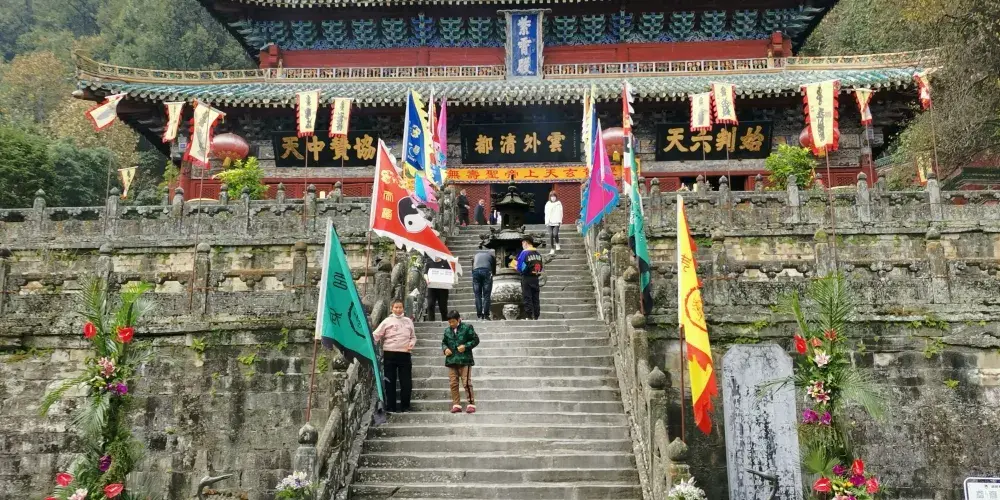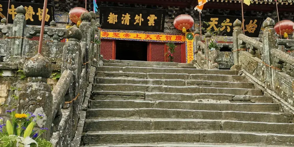 南巖宮附近的飛升崖(岩)也是值得一遊的地方,這裡三面是絕壁,一條小路可以到達峰頂,在這裡眺望遠方,山中美景盡收眼底。傳說中,真武大帝年輕時就在這裡修練幾十年後飛升成仙。飛升崖上有一塊伸出岩壁的巨石,叫“試心石”,相傳真武就是從這塊巨石上跳下而升天的。巨石下臨萬丈深淵,十分危險,如果你來這裡遊玩,千萬要注意安全,不要去涉足這塊巨石。