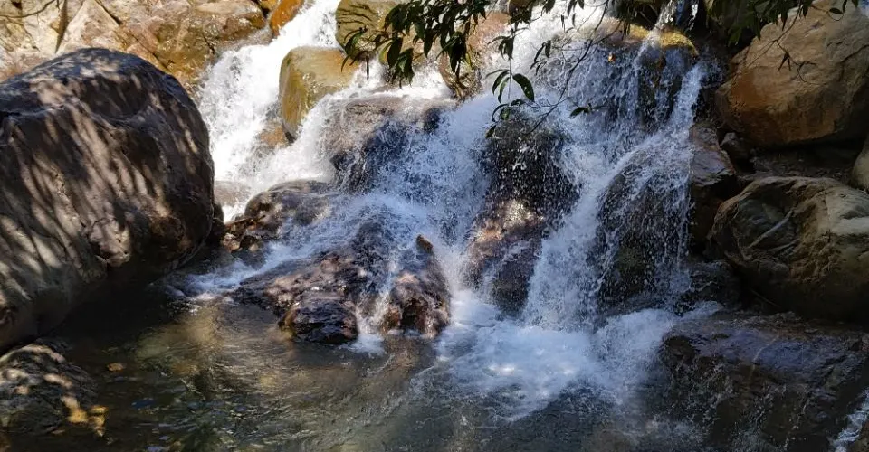 沿登山曲徑至山腰岔路右折,過眠綠亭,即到飛水潭。飛水潭瀑布白練懸空,高30餘米,從懸崖峭壁間傾瀉而下,聲震雷鳴,霧障雲騰。潭上時而激起滿空飛雪,時而陽光折射,彩虹橫空。站在潭畔觀瀑亭上觀賞,沁人肺腑,心曠神怡。