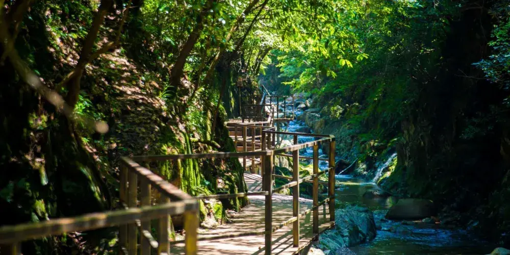 醉山野黃崖大峽谷是醉山野景區並不算太大,卻濃縮了皖南自然山水的精華。水壩、翠潭、疊瀑、彩林、山峯、比比皆是。為增強黃崖大峽谷內景點的多樣性和娛樂性,先後投入使用了高空滑索和頗具趣味的吶喊噴泉。另外景區內還新建了一座5D高空玻璃橋—醉仙谷玻璃天橋,玻璃天橋全長218米,地面懸空高度108米,非常的驚險刺激。