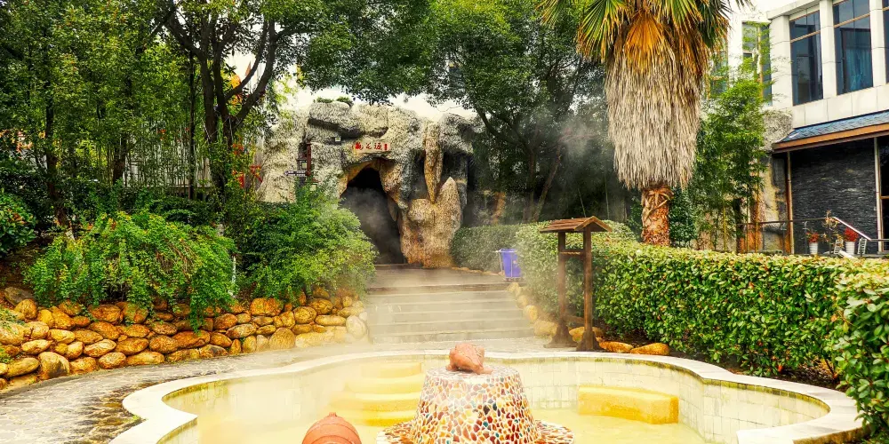 醉石溫泉坐落在醉石景區內,這里風景秀麗,周邊群峰環繞,峽谷幽長。醉石溫泉內的溫泉水十分清澈,分區種類也很多,有桃花美容養顏區、溶洞溫泉區、森林養生浴、SPA水療區、梅花池等,整體的規劃也體現了陶淵明式的田園山水風情。