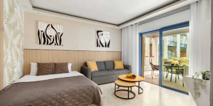 在奢華的皇家公園度假村 (Royal Park Resort) 內這間精美的公寓體驗完美的家庭度假。這套設施齊全的公寓設有一間帶雙人床的卧室、一間浴室、一間帶雙人床和沙發(可打開成雙人床)、一間小廚房以及一個帶休息區的小陽台。最多可容納 6 位客人。公寓設有公共遊泳池、戶外燒烤區和綠色花園。公寓已為您準備好完美假期所需的一切:從床單、毛巾、廚房用具到咖啡膠囊。這套公寓完全屬於您,您可以自由使用度假村的公共區域,包括大型泳池。Sea N' Rent 是以色列最大的度假物業租賃公司,在埃拉特、特拉維夫、提比里亞等黃金地段擁有 200 套度假屋。從帶私人泳池的豪華別墅到精品公寓,我們提供各種度假屋,助您打造完美的家庭度假體驗。