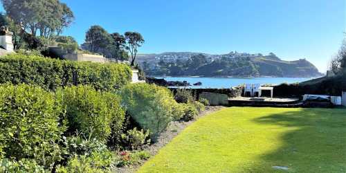 (Seaweed Cottage in Fowey overlooking the beach with a garden and a parking space)
