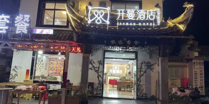 在黃山高鐵站後面的小社區裡面,從黃山高鐵站出來後往左邊走,走涵洞繞回高鐵的另一邊,直走後面對的看到眼前的那一戶就是開蔓飯店。老闆娘非常熱情,並且有耐心,房間也乾淨,還免費幫我們升等,真的是很感謝老闆娘。飯店還兼賣飲料,飲料非常實惠又很好喝。附近也有幾間飯館可以吃飯。作為住一晚經費有限的旅客,實在是一個好的住處地方。