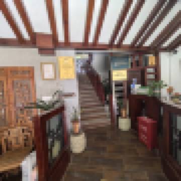庭院的左側,是由二樓客房折角而下的樓梯,樓梯出口,是由樸拙而雅緻的書掛、古老的清代木雕人物櫃、羊皮立燈、古色古香的畫案以及小葉紫檀博古架組合而成的書齋,這是住宿的雅客們用早餐的地方,書房裏提供的一碗麪、一份簡餐都極盡温暖。