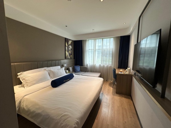 非常滿意,周邊交通方便,前廳姚經理免費做了房型升級,有一個小沙發,房間很安靜,晚上貼心安排機器人送了甜品到房間。枕頭有兩種選擇,晚上休息得不錯。房間有桌子全身鏡,出差方便。2樓有洗衣房健身房,總體性價比不錯。見圖。