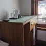 A fridge, a kettle , coffee, tea , cocoa powder and milk for coffee are provided.