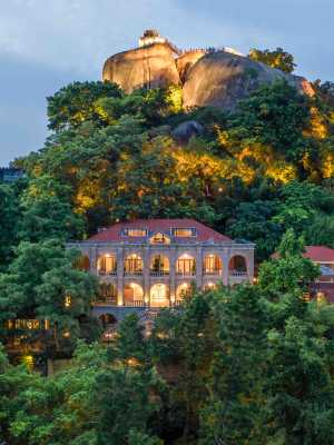 聆海老別墅藏身於日光巖景區的南麓半山處,依山而立,向海而生。百年英式宅邸掩映於婆娑的山石古榕下,敦厚的石砌牆將整個宅邸與世隔絕。