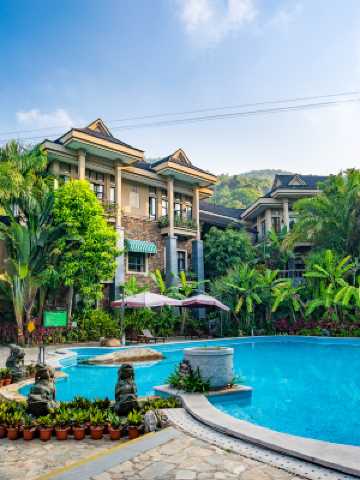 酒店位於海南省保亭縣,毗鄰海南呀諾達雨林文化旅遊區、海南檳榔谷黎苗旅遊區兩家5A級景區。G224國道可直達,三亞到保亭的車程縮短至30分鐘,各項交通便捷。 酒店配套設施完善,酒店擁有標準間、二居室套房、泳池、中餐廳、小型會議室、健身房、麻將房、KTV、中醫館服務等等,營造出了莊園般的別樣景緻,特別適合康養度假休閒的好地方。 此處位於熱帶海洋季風氣候區,年平均氣温20.7-24.5℃,山區山清水秀、雲霧繚繞、森林茂密、雨量充沛,負氧離子濃度在每立方厘米8200個以上,可謂“温而不熱、涼而不寒、爽而不燥、潤而不潮”。 為滿足住店賓客的健康需求,酒店每日8:00 - 8:30免費推出拍八虛、晨練八段錦活動;此外,每週六、週日上午9:00 - 11:00免費提供解壓療愈、抄寫心經、繪畫、手工製作等有益身心健康的活動。