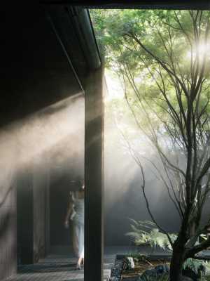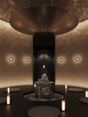 酒店整體以黑白灰為基本色調,飾以淺淺的大地色,外觀呈現具有質感的黑色。入口旁玻紋流動,朦朧的玻璃造成視覺上的模糊,像是混沌中流動的幕牆,幕牆內外隔絕兩個世界;傾斜的門框通向未知的領域。在夜晚,門口的光影裝置夢幻美麗,在發散的暖黃的光線下,整個酒店仿若來自平行時空,在暗夜中睡眠,在時空中穿梭。它靜悄悄地來,靜悄悄地去,又彷彿暗夜中的一個靜置的夢境,裹挾了神祕的氣息,帶領睡夢中的旅客通往時空的下一站。 在我們的願景中,不僅僅只是一個酒店,更是時空的交流者、探索者,探索生命、文化的邊緣。