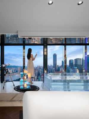 酒店房間朝向面向來福士、解放碑、長江嘉陵江等,任何朝向都能看到重慶的地標景觀,白天可以看到重慶的人文景觀,夜晚的夜景也是直接映入眼簾,逐步出戶,別墅般的城中生活;中區精緻小戶,中等高度直觀的窗外視野,性價比超值的一款戶型房間;空中小別墅,高層高度臨空視角,重慶景觀、夜景一覽無遺;高空浮雲觀景套,超高層房間,全方位視角,超遠視野,俯瞰重慶全景,超完美夜景。