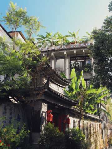 院內融入了30多套藝術品級的老鵰花格子門窗,和老石缸石磨,古門窗製作的傢俱,以及數不清的傳統手工製作的古建青磚、青瓦、磚碉、瓦花。每個房間都帶着小花園、整個樓頂都是空中花園,每個角落都種滿了各種綠植花草,讓人有一種置身小森林的感覺,整個建築把巍山的傳統文化和各種綠植融入其中,自成一番獨特美景。