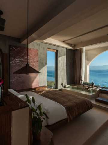 酒店位於大理市磻溪村網紅s灣生態廊道一線海景,將侘寂風與中古風巧妙混搭,打造出別具一格的民宿空間,盡顯美學與經典魅力。選材上,運用自然木材、肌理環保塗料,棉麻等營造侘寂風的質樸與本真,搭配中古風的復古擺件,彰顯時光沉澱的精緻。房間配備:慕思床墊、鵝絨被,HCK哈士奇復古小冰箱,高檔意式洗護用品,全套美國科勒衞浴(高配全智能馬桶)以及智能投影設備。燈光設計以暖色調為主,營造柔和温馨的氛圍,讓人倍感鬆弛。每一個角落都經過精心設計,充滿故事感,融合窗外一線海景,隨手一拍皆可出片,為住客帶來難忘的視覺體驗與心靈休憩享受。