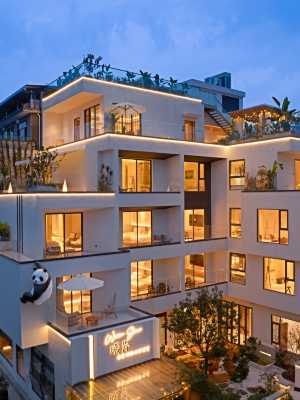 這是一家以熊貓文化為主題的庭院式酒店,設計凸顯的是“鬧中取靜”的休閒氛圍,庭院清幽,古樹參天。