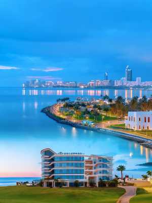 酒店坐落於海口市中之島“海甸島”,面朝海甸河入海口、毗鄰瓊州海峽,270度觀海角度的主樓建築,坐擁海甸河及瓊州海峽的無垠海景和城市繁華。