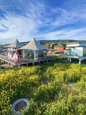 海晏蕃域山坡酒店位於三角城卧佛山,擁有二十餘間星空客房,特色帳篷宿營客房,在草原腹地感受“地窩子”式的自然旅居方式,登頂卧佛山可俯覽整個西海鎮、海晏縣,風光無限。