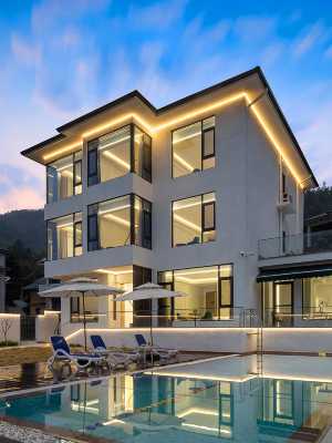 坐落於靜謐的山谷間,以現代簡約風格呈現,外觀潔白如瑕,三層小樓錯落有致,屋頂平展,露台寬敞,視野極佳。民宿前,一方清澈泳池波光粼粼,倒映着周圍温暖的燈光,幾把藍色躺椅與遮陽傘靜待賓客休憩。抬眼望去,遠處山巒疊嶂,黃昏的天空染上了橙黃,寧靜而優雅。花築·櫻語民宿,是您遠離塵囂、盡享寧靜時光的理想之選。