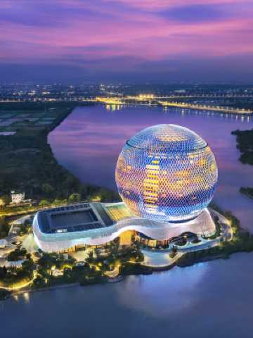 酒店坐落於浙江省湖州市風景宜人的南太湖之濱,晚上在外牆燈光的裝扮下 “指環”型建築變幻出五彩斑斕的絢麗圖案,水中的倒影猶如一輪被塗上了色彩的彎月。近太湖龍之夢樂園,僅5min車程。