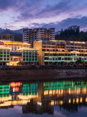 酒店周圍自然風景原始而獨具瑤族風情,集商務休閒、養生為一體,擁有室外大型文化舞台、特色餐廳、多功能會議中心、網球場、游泳池、生態温泉、兒童天地等,集領先設施與服務於一身,是您休閒養生度假的好聖地。