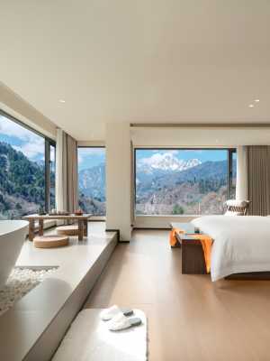 酒店是對藏族文化的現代詮釋,酒店中流淌着寧靜的溪流,旨在激發人與自然之間的和諧。酒店坐落於山巒環繞、羣山環抱的中查溝,客人可以在房間的陽台或者擁有山景或湖景的客房內享受輕鬆愜意的住宿體驗。
