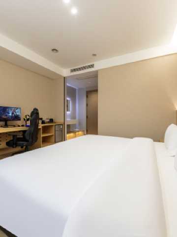 [酒店硬件] 大床尺寸2米*2.1米,乳膠床墊,55寸支持投屏智能電視,獨立冷暖空調,5秒鐘熱水,部分房間陽台南湖公園景觀,速幹吹風機,百兆寬帶上網-下載速度7mb/s。