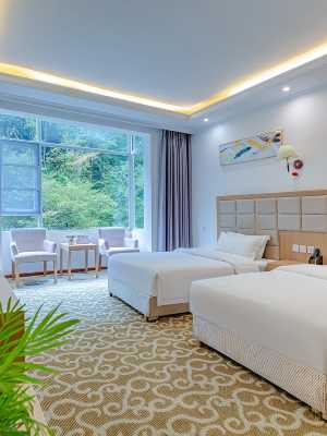 酒店大廳二樓配套有休息區,裝修環境優雅,寬敞明亮,配有茶室,棋牌和休閒娛樂。酒店依山臨河而建,羣山環抱,一年四季皆不同景,春可賞百花,夏可避暑,秋賞紅葉,冬看雪。