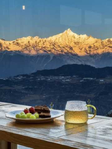 民宿房型是古代八雅命名,琴、棋、書、畫、詩、酒、花、茶,帶有書香氣息,裝修設計軟裝和名字相呼應,古香古色的民宿味道,早晨從房間就能遠眺對面雪山,天氣好還能看到日照金山,夜晚可以看落日晚霞,喝茶聊天過天然山居生活。