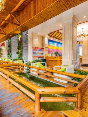 酒店坐落在美麗的瑞麗江河畔南岸,酒店建築形態體現了當地民族文化與東南亞文化的融合,在規劃設計之初就已融入自然保護的理念,認真衡量建築和自然之間的密切關係,使酒店因形就勢,藏在山間、隱沒林中,層疊錯落有置。酒店配有舒適湯屋、江景別墅、特色餐廳等設施,更有獨特的峽谷式亞熱帶雨林風主題温泉,讓賓客身處亞熱帶雨林懷抱之中,面江而居,奢享自然,疊級式的建築讓賓客飽覽無與倫比的瑞麗江風光。酒店通過民族、風情、空間、創意和景觀打造出既充分融合東南亞文化又富有多民族風情的温泉度假勝地。