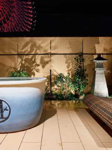 房間設計以「融合今昔地標」為題, 古人在天保山上興建了高燈籠(古時的燈塔)為船隻指引方向, 現在則由摩天輪取而代之,成為新地標。 在頂樓上風呂沐浴時,您會看見那座高燈籠, 以及無與倫比的摩天輪和夜景。 大阪地鐵中央線大阪港站,步行 5 分鐘。