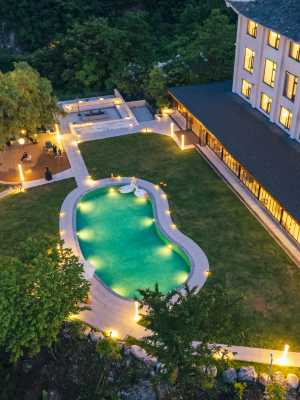 隱於神農架木魚鎮的山水畫卷中,溪澗堂以白牆灰瓦勾勒中式雅緻,以花木扶疏編織庭院幽夢。晨起推窗,山嵐漫過青瓦,鳥鳴跌進露台的茶香;午後閒坐,可於清吧聽風,或在泳池畔枕陽光小憩;入夜觀星,木質格柵間漏下細碎星光,地暖温柔擁裹每一寸疲憊。十二間客房皆含觀景之趣,或攬遠山如黛,或望庭中竹影搖曳,更有貼心服務藏於細節——代客泊車、租車嚮導,讓山水之約無拘無束。近攬神農壇的古樸、天生橋的靈秀、官門山的靈動,後者以熊貓館的憨態可掬與地質博物館的時光沉澱,成為親子與求知者的嚮往之境。民宿雖處鎮心,卻獨守一隅靜謐,恰似塵世喧囂外的桃源渡口,等你卸下行囊,在茶香與星光裏,重拾生活的詩意與從容。